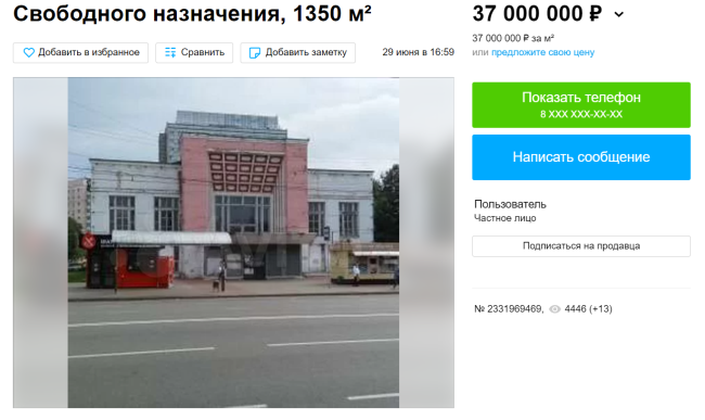 Так, за эту сумму можно получить здание площадью 1350 кв. м. и земельный участок в 25 соток. Как следует из объявления, бывший кинотеатр продает частное лицо. Отметим, что на продажу здание выставили 29 июня.