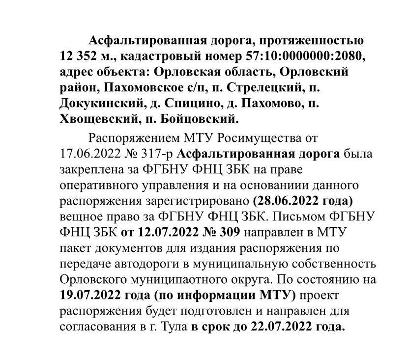 По словам Лежнева, за то, чтобы дорогу передали в муниципалитет, правительство Орловской области бьется пять лет. На асфальтирование дороги нужно около 150 млн рублей.