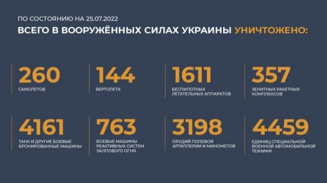 Всего с начала проведения специальной военной операции уничтожены: 260 самолетов, 144 вертолета, 1611 беспилотных летательных аппаратов, 357 зенитных ракетных комплексов, 4161 танк и других боевых бронированных машин, 763 боевые машины реактивных систем залпового огня, 3198 орудий полевой артиллерии и минометов, а также 4459 единиц специальной военной автомобильной техники.