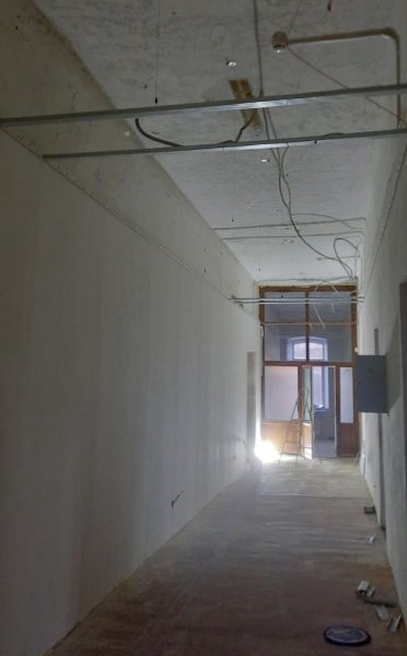 Сейчас завершены демонтажные работы, заложены необходимые проемы, закончены работы по штукатурке и облицовке стен ГКЛ, расчистке, штукатурке и разборке потолков. Шпатлевка стен выполнена на 50%. Ведется работа по возведению перегородок, устройству натяжных и подвесных потолков, замене элементов устройства крыши.