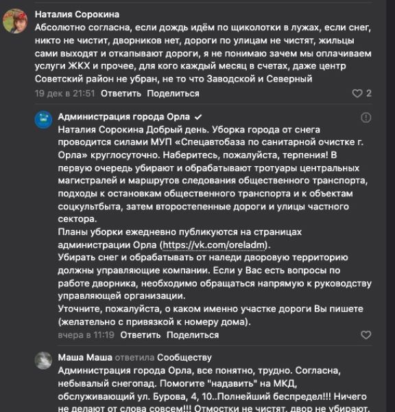Жители Орла продолжают в соцсетях выражать недовольство неочищенными от снега улицами. Тем временем в мэрии горожан призывают потерпеть и дождаться, когда очередь дойдет до уборки их улиц.