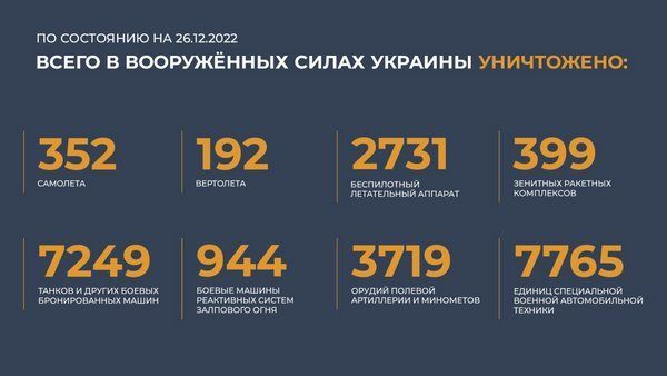 Всего с начала проведения специальной военной операции уничтожены: 352 самолета, 192 вертолета, 2731 беспилотный летательный аппарат, 399 зенитных ракетных комплексов, 7249 танков и других боевых бронированных машин, 944 боевые машины реактивных систем залпового огня, 3719 орудий полевой артиллерии и минометов, а также 7765 единиц специальной военной автомобильной техники.