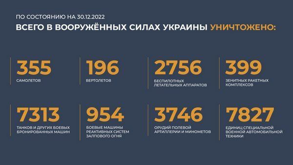 Всего с начала проведения специальной военной операции уничтожены: 355 самолетов, 196 вертолетов, 2756 беспилотных летательных аппаратов, 399 зенитных ракетных комплексов, 7313 танков и других боевых бронированных машин, 954 боевые машины реактивных систем залпового огня, 3746 орудий полевой артиллерии и минометов, а также 7827 единиц специальной военной автомобильной техники.