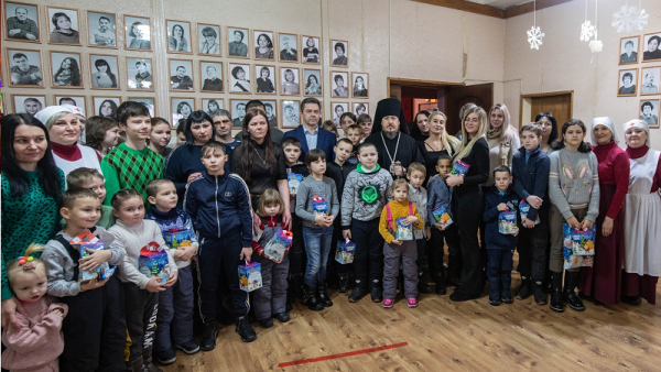 Помимо детей мобилизованных резервистов на концерте присутствовали дети, ставшие вынужденными переселенцами из ДНР, ЛНР и Украины. С ними пообщался епископ Нектарий и раздал подарки.