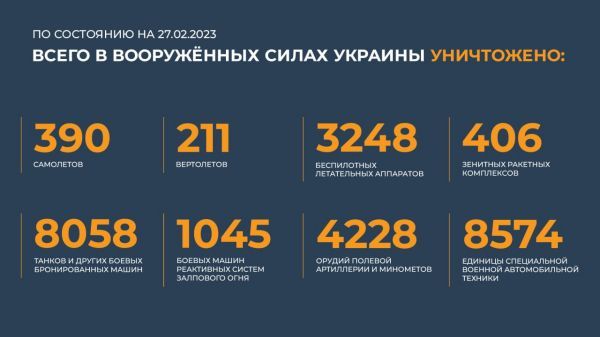 Всего с начала проведения специальной военной операции уничтожены: 390 самолетов, 211 вертолетов, 3248 беспилотных летательных аппаратов, 406 зенитных ракетных комплексов, 8058 танков и других боевых бронированных машин, 1045 боевых машин реактивных систем залпового огня, 4228 орудий полевой артиллерии и минометов, а также 8574 единицы специальной военной автомобильной техники.