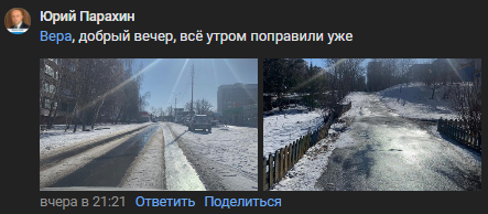 Градоначальник в ответ прислал две фотографии, вероятно, экстренно полученные от подчинённых. Обе производили визуальное впечатление относительной благоустроенности. Но на одной из них была запечатлена автомобильная дорога, а не тротуар, на который жаловались люди. Другая же была сделана неподалёку, и также не имела отношения к претензиям граждан.