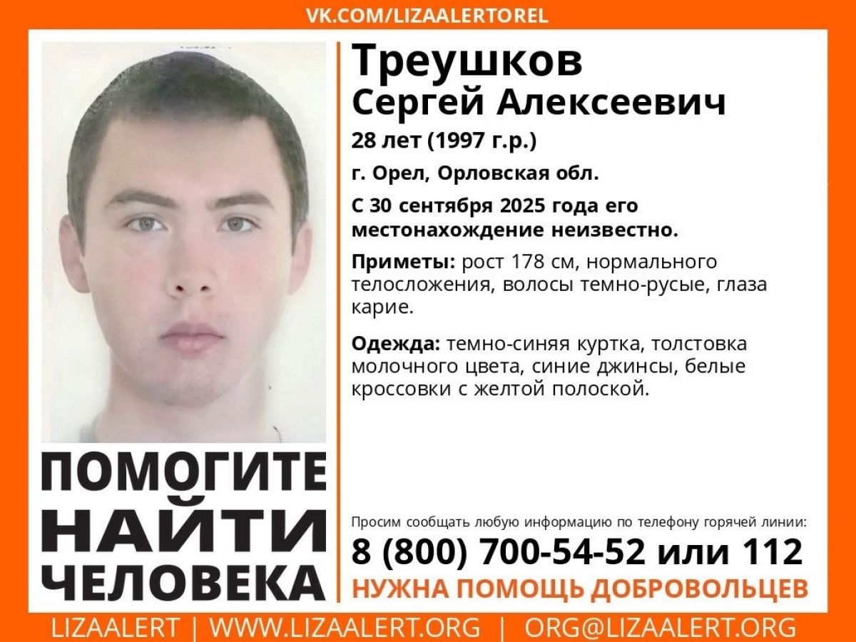 Спустя два дня, 30 сентября, в том же Орле перестал выходить на связь Сергей Треушков, 1997 года рождения. Ему полных 28 лет. Молодой человек ростом 178 см имеет нормальное телосложение, темно-русые волосы и карие глаза. Его последней одеждой стали темно-синяя куртка, молочная толстовка, синие джинсы и белые кроссовки с желтой полоской.
