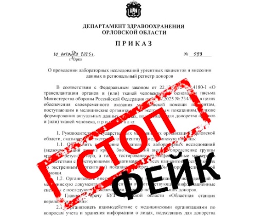 Департамент здравоохранения Орловской области предупредил жителей региона о появлении в сети очередного фейкового приказа. На этот раз «о проведении лабораторных исследований ургентных пациентов и внесении данных в региональный регистр доноров».