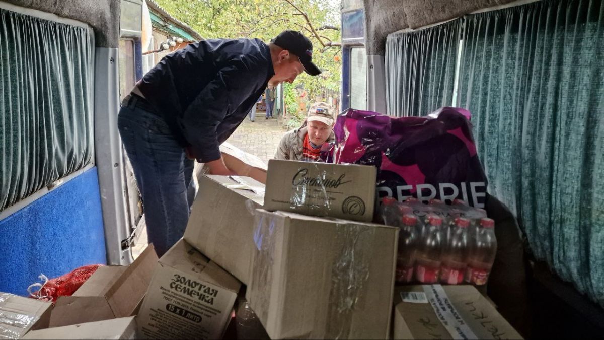 Первой остановкой волонтеров стал поселок Залегощь. Здесь к двум волонтерам присоединяется третий товарищ по гуманитарке, сотрудник полиции Владимир.