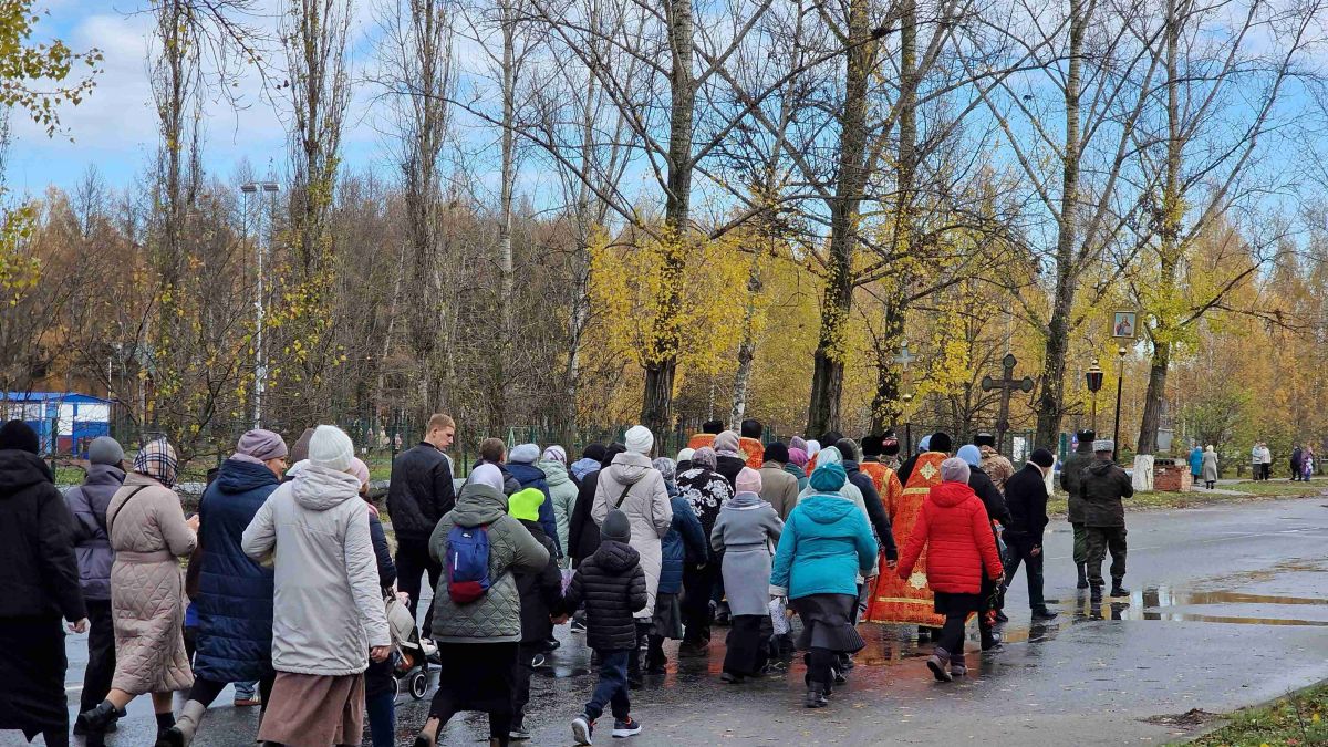 Через полчаса на съезде с трассы видны священнослужители в ало-золотых одеяниях и облаченный в черную рясу епископ Ливенский и Малоархангельский Нектарий. Свернув с трассы, шествие продолжает путь через поле по разбитому асфальту.
