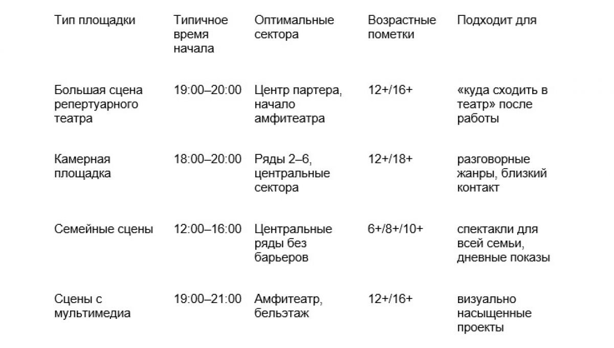 Разговорная драма выигрывает от близкой посадки и тихого зала; музыкальные и пластические формы — от амфитеатра с широким углом обзора; документальные проекты требуют внимательного чтения аннотации (вербатим, интервью, минимализм сценографии), где «ближе» не всегда «лучше». Эти маркеры удобны, когда решаете, куда сходить в театр в Москве сегодня или на следующей неделе.