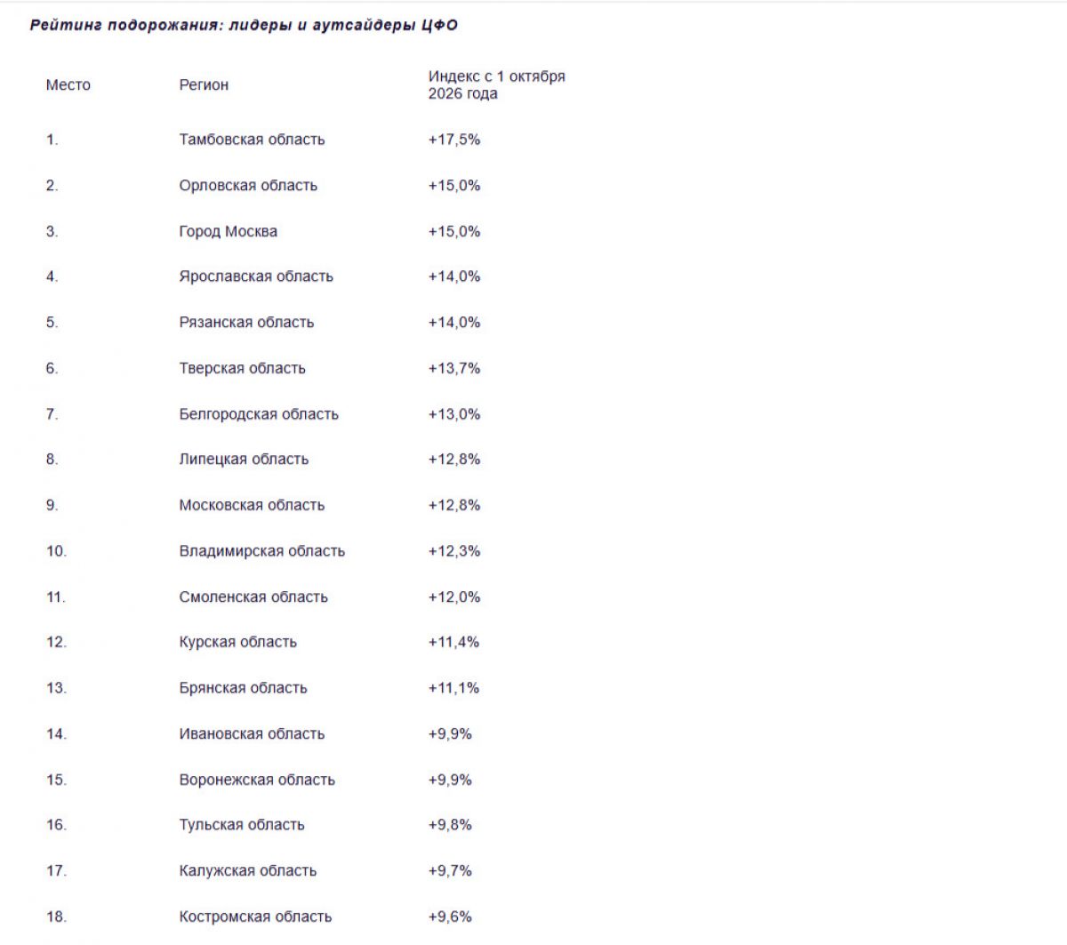 Сильнее, чем в Орловской области, тарифы вырастут лишь в Тамбовской. Там цены поднимут сразу на 17,5%. Меньше всего (+9,6%) повышение тарифов ощутят жители Костромской области.