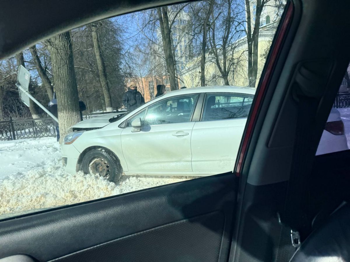 Фотофакт: в Орле возле здания ФСБ легковушка влетела в дерево и снесла знак