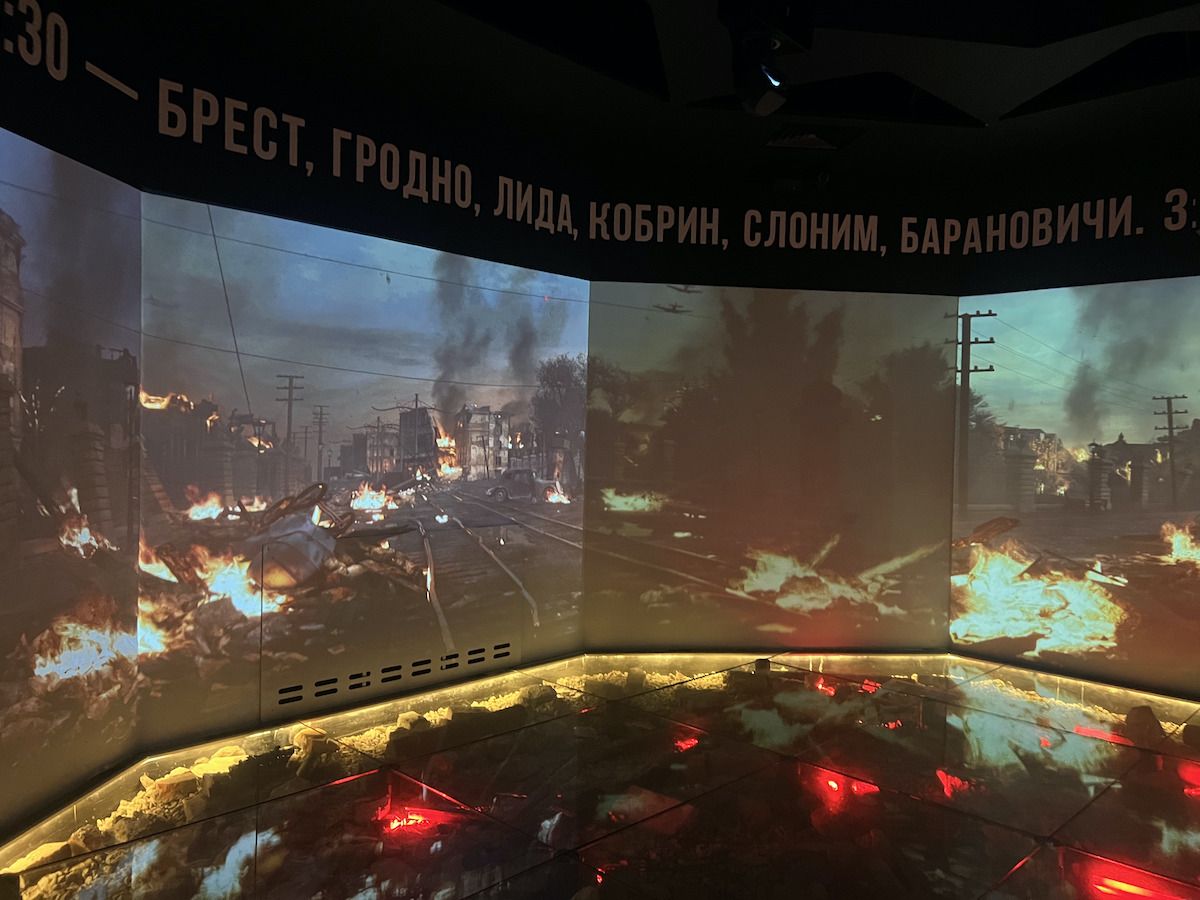 И вот ты делаешь еще несколько шагов, как вдруг всюду начинают звучать тревожные звуки наступающей беды. Еще шаг — и началась война. Крутишь головой и видишь картины-исполины из хроники этой войны. Приглядываешься и вдруг понимаешь, что сложены они, как мозаика, из фотокарточек павших, наших героических фронтовиков, кто еще вчера трудились на заводах, приглашали девушек в кино, катались на трамваях, играли в футбол, пели песни и танцевали…