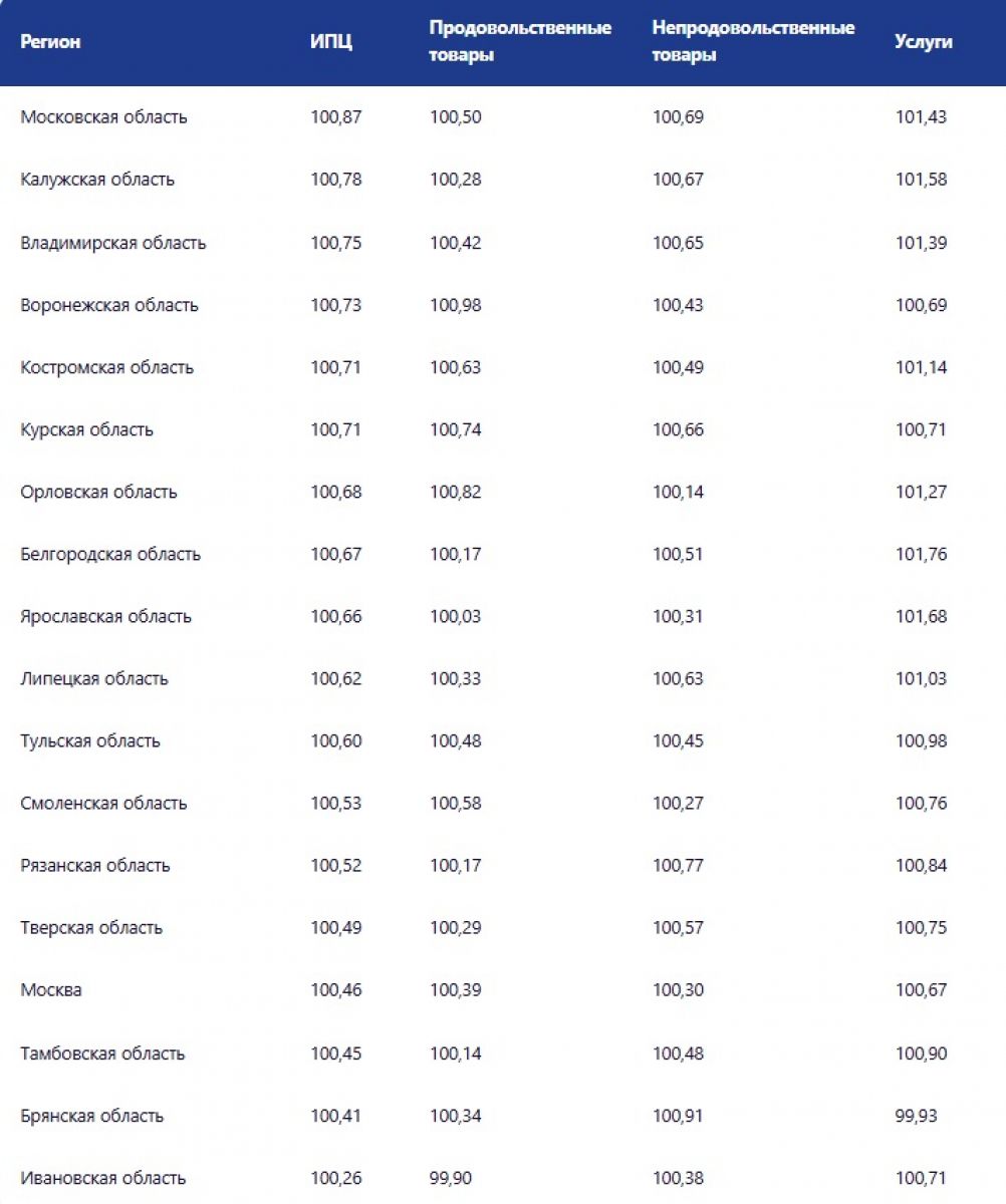 Данные по уровню инфляции в регионах ЦФО представлены в таблице.