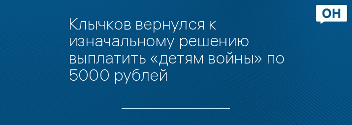«У нас 47 тысяч детей войны. По 5 тысяч рублей уже выплатили несовершеннолетним узникам концлагерей. Понимая, что значительная часть людей – это несовершеннолетние узники, и те, кто попал в другие льготные категорию – получают другие льготы и хоть какие-то средства получили. И решение, которое я буду подписывать - по 5 тысяч рублей для тех, кто не получает других льгот. Выплаты будут осуществлены до 15 мая», - сказал Клычков 29 апреля в ходе прямого эфира в соцсетях.