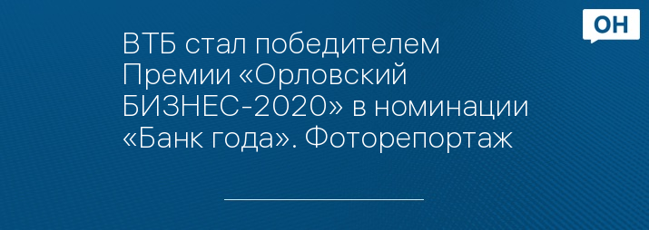 Орловский ВТБ признан экспертами Премии «Орловский БИЗНЕС-2020» победителем в номинации «Банк года».