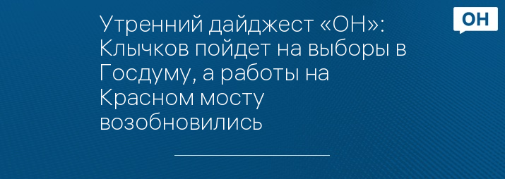 Утренний дайджест «ОН»: Клычков пойдет на выборы в Госдуму, а работы на Красном мосту возобновились